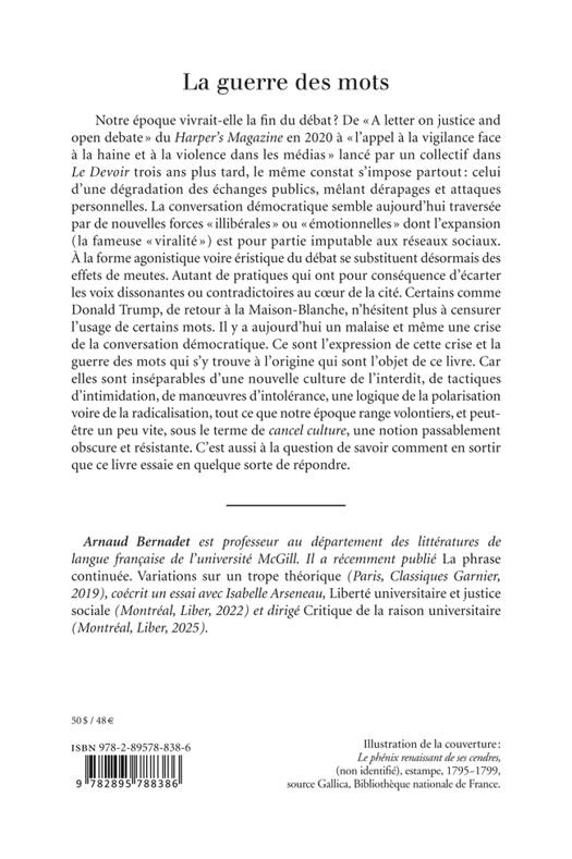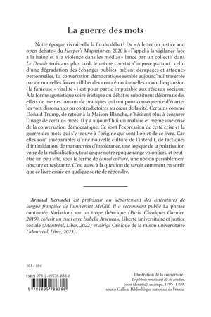 Notre époque vivrait-elle la fin du débatâ? De «âA letter on justice and open debateâ» du Harper’s Magazine en 2020 à «âl’appel à la vigilance face à la haine et à la violence dans les médiasâ» lancé par un collectif dans Le Devoir trois ans plus tard, le même constat s’impose partout : celui d’une dégradation des échanges publics, mêlant dérapages et attaques personnelles. La conversation démocratique semble aujourd’hui traversée par de nouvelles forces «âillibéralesâ» ou «âémotionnellesâ» dont l’expansion (âla «âviralitéâ»â) est pour partie imputable aux réseaux sociaux. À la forme agonistique voire éristique du débat se substituent désormais des effets de meutes. Autant de pratiques qui ont pour conséquence d’écarter les voix dissonantes ou contradictoires au coeur de la cité. Certains comme Donald Trump, de retour à la Maison-Blanche, n’hésitent plus à censurer l’usage de certains mots. Il y a aujourd’hui un malaise et même une crise de la conversation démocratique. Ce sont l’expression de cette crise et la guerre des mots qui s’y trouve à l’origine qui sont l’objet de ce livre. Car elles sont inséparables d’une nouvelle culture de l’interdit, de tactiques d’intimidation, de manoeuvres d’intolérance, une logique de la polarisation voire de la radicalisation, tout ce que notre époque range volontiers, et peut-être un peu vite, sous le terme de cancel culture, une notion passablement obscure et résistante. C’est aussi à la question de savoir comment en sortir que ce livre essaie en quelque sorte de répondre.