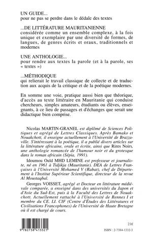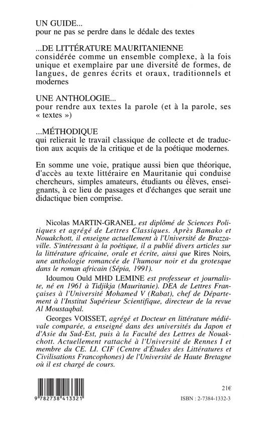 Des regards croisés entre les recherches littéraires de l'intérieur et de l'extérieur de la Mauritanie ont guidé l'élaboration de cette anthologie. Les auteurs visent à fournir un échantillonnage représentatif des principaux genres, types, formes et tendances iventoriés à ce jour (cf. l'introduction, p. 7-17). Deux parties: L'écrit paralittéraire et littéraire - L'oral dit et chanté.