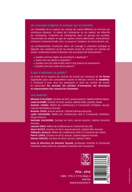I. Promesse d'embauche II. Essai III. Apprentissage IV. Résiliation conventionnelle V. Démission VI. Prise d'acte VII. Licenciement pour motif personnel VIII. Licenciement pour inaptitude physique IX. Plan de départs volontaires X. Licenciement pour motif économique XI. Accord de mobilité XII. Accord de maintien de l'emploi XIII. Transfert d'entreprise XIV. Contrat de travail à durée déterminée XV. Contrat de mission XVI. Contrat de chantier XVII. Mise à disposition XVIII. Salarié expatrié XIX. Salariés protégés XX. Retraite XXI. Ruptures judiciaires du contrat de travail XXII. Statuts particuliers XXIII. Contrats aidés XXIV. Suites de la rupture XXV. Contentieux de la rupture