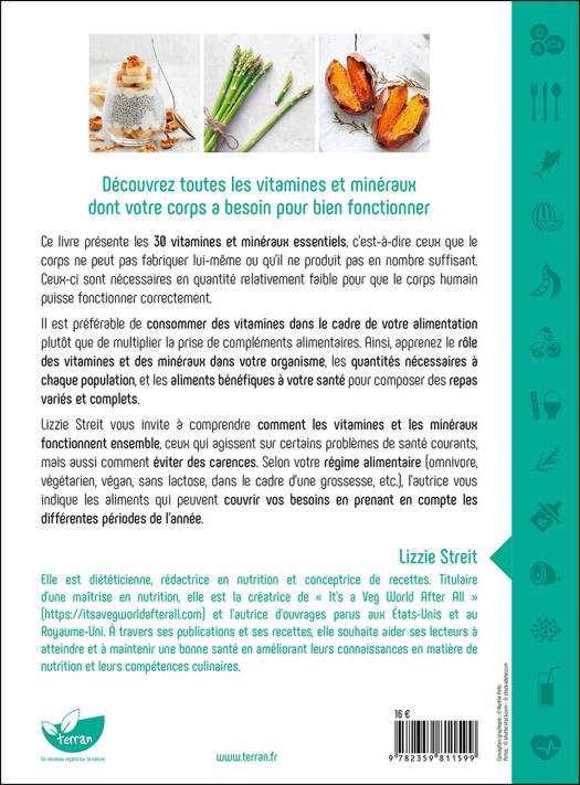 Découvrez toutes les vitamines et minéraux dont votre corps a besoin pour bien fonctionner. Ce livre présente les 30 vitamines et minéraux essentiels, c’est-à-dire ceux que le corps ne peut pas fabriquer lui-même ou qu’il ne produit pas en nombre suffisant. Ceux-ci sont nécessaires en quantité relativement faible pour que le corps humain puisse fonctionner correctement. Il est préférable de consommer des vitamines dans le cadre de votre alimentation plutôt que de multiplier la prise de compléments alimentaires. Ainsi, apprenez le rôle des vitamines et des minéraux dans votre organisme, les quantités nécessaires à chaque population, et les aliments bénéfiques à votre santé pour composer des repas variés et complets. Lizzie Streit vous invite à comprendre comment les vitamines et les minéraux fonctionnent ensemble, ceux qui agissent sur certains problèmes de santé courants, mais aussi comment éviter des carences. Selon votre régime alimentaire (omnivore, végétarien, végan, sans lactose, dans le cadre d’une grossesse, etc.), l’autrice vous indique les aliments qui peuvent couvrir vos besoins en prenant en compte les différentes périodes de l’année.
