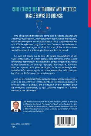 Une équipe multidisciplinaire composée d'experts appartenant au service des urgences, au département des maladies infectieuses, en pharmacologie et en microbiologie a lancé conjointement en mai 2020 la rédaction conjointe du livre Guide sur les traitements anti-infectieux aux urgences, dont le cadre global et le contenu sont déterminés à la suite de plusieurs réunions de travail. Ce livre est conçu sur la base de larges consultations et de vastes discussions, en tenant compte des dernières avancées des recherches nationales et internationales et des consensus dans des guides pertinents. Cet ouvrage regroupe sept chapitres, abordant tous les aspects de la pharmacologie, de la microbiologie, des maladies infectieuses aiguës et du traitement des infections par bactéries multirésistantes aux médicaments. Axé sur les maladies infectieuses aiguës courantes aux urgences, ce livre se concentre sur le traitement anti-infectieux empirique. Il se veut concis et pratique, afin de devenir un bon assistant pour les médecins urgentistes, ce qui constitue l'espoir et l'attente communs des rédacteurs !