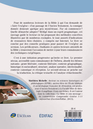Pour de nombreux lecteurs de la Bible à qui l’on demande de « faire l’exégèse » d’un passage de l’Ancien Testament, la consigne donnée demeure quelque peu mystérieuse. Par où commencer ? Quelle démarche adopter ? Rédigé dans un esprit pragmatique, cet ouvrage guide le lecteur en lui proposant des méthodes concrètes illustrées par de nombreux exemples, le tout assorti d’indications de ressources bien choisies, y compris sur Internet. Le livre se conclut par des conseils pratiques pour passer de l’exégèse au sermon. Les prédicateurs, étudiants et autres lecteurs attentifs de la Bible y trouveront l’occasion de mettre à jour leurs connaissances des techniques exégétiques.