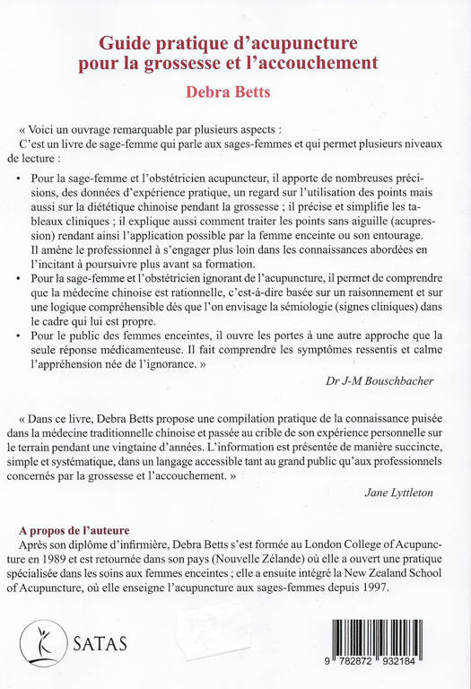" Voici un ouvrage remarquable par plusieurs aspects : C'est un livre de sage-femme qui parle aux sages-femmes et qui permet plusieurs niveaux de lecture : Pour la sage-femme et l'obstétricien acupuncteur, il apporte de nombreuses précisions, des données d'expérience pratique, un regard sur l'utilisation des points mais aussi sur la diététique chinoise pendant la grossesse; il précise et simplifie les tableaux cliniques ; il explique aussi comment traiter les points sans aiguille (acupression) rendant ainsi l'application possible par la femme enceinte ou son entourage. Il amène le professionnel à s engager plus loin dans les connaissances abordées en l'incitant à poursuivre plus avant sa formation : Pour la sage-femme et l'obstétricien ignorant de l'acupuncture, il permet de 'comprendre que la médecine chinoise est rationnelle, c'est-à-dire basée sur un raisonnement et sur une logique compréhensible dès que l'on envisage la sémiologie (signes cliniques) dans le cadre qui' lui est' propre. Pour le public des femmes enceintes, il ouvre les portes à une autre approche que la seule réponse médicamenteuse. Il fait comprendre les symptômes ressentis et calme l'appréhension née de l'ignorance. "