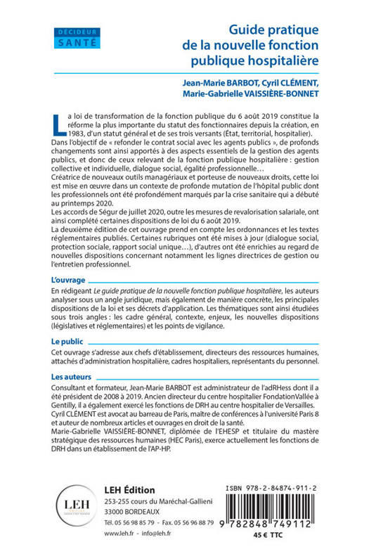 L’ouvrage En rédigeant Le guide pratique de la nouvelle fonction publique hospitalière, les auteurs analyser sous un angle juridique, mais également de manière concrète, les principales dispositions de la loi et ses décrets d’application. Les thématiques sont ainsi étudiées sous trois angles : les cadre général, contexte, enjeux, les nouvelles dispositions (législatives et réglementaires) et les points de vigilance.