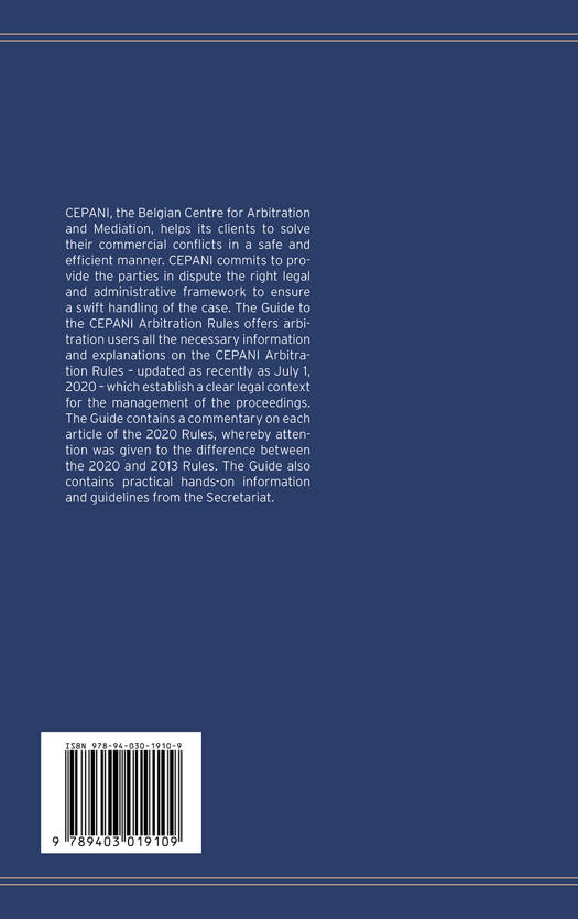 CEPANI, the Belgian Centre for Arbitration and Mediation, helps its clients to solve their commercial conflicts in a safe and efficient manner. The Guide to the CEPANI Arbitration Rules offers arbitration users all the necessary information and explanations on the CEPANI Arbitration Rules – updated as recently as July 1, 2020 – which establish a clear legal context for the management of the proceedings. The Guide contains a commentary on each article of the 2020 Rules, whereby attention was given to the difference between the 2020 and 2013 Rules. The Guide also contains practical hands-on information and guidelines from the Secretariat. CEPANI, the Belgian Centre for Arbitration and Mediation, helps its clients to solve their commercial conflicts in a safe and efficient manner. The Guide to the CEPANI Arbitration Rules offers arbitration users all the necessary information and explanations on the CEPANI Arbitration Rules – updated as recently as July 1, 2020 – which establish a clear legal context for the management of the proceedings. The Guide contains a commentary on each article of the 2020 Rules, whereby attention was given to the difference between the 2020 and 2013 Rules. The Guide also contains practical hands-on information and guidelines from the Secretariat.