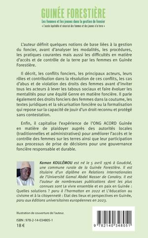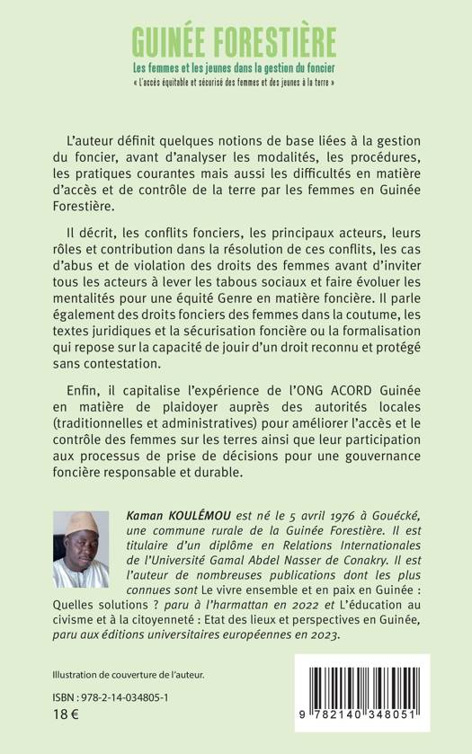 L'auteur définit quelques notions de base liées à la gestion du foncier, avant d'analyser les modalités, les procédures, les pratiques courantes mais aussi les difficultés en matière d'accès et de contrôle de la terre par les femmes en Guinée Forestière. Il décrit, les conflits fonciers, les principaux acteurs, leurs rôles et contribution dans la résolution de ces conflits, les cas d'abus et de violation des droits des femmes avant d'inviter tous les acteurs à lever les tabous sociaux et faire évoluer les mentalités pour une équité Genre en matière foncière. Il parle également des droits fonciers des femmes dans la coutume, les textes juridiques et la sécurisation foncière ou la formalisation qui repose sur la capacité de jouir d'un droit reconnu et protégé sans contestation. Enfin, il capitalise l'expérience de l'ONG ACORD Guinée en matière de plaidoyer auprès des autorités locales pour améliorer l'accès et le contrôle des femmes sur les terres ainsi que leur participation aux processus de prise de décisions pour une gouvernance foncière responsable et durable.