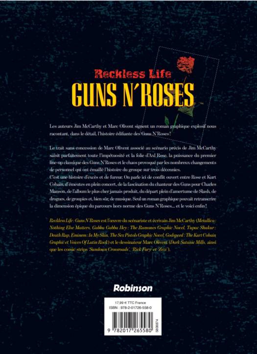 Le sublime trait de Marc Olivent et le récit incisif de Jim McCarthy capturent à la perfection l’esprit dangereux d’Axl Rose, la première formation iconique des Gun’s and Roses et les nombreux changements de composition du groupe à travers 3 décennies. Une histoire d’excès tapageurs : la querelle avec Kurt Cobain, les dérapages en concerts, la fascination de Rose pour Charles Manson, l’album le plus cher jamais produit, le départ amer de Slash, la drogue, les groupies, et bien sûr, la musique. Seul un roman graphique pouvait rendre justice à l’épique histoire des Guns and Roses… Et c’est celui-là.