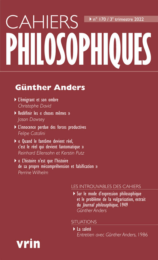 Les articles qui composent ce numero mettent en evidence la coherence philosophique de l'uvre de Gunther Anders, coherence associee a une vive critique de toute pensee systematique. Il importe que la philosophie se confronte aux questions contemporaines les plus urgentes, qu'elle devienne une reflexion attentive a la concretude des choses du monde, en particulier celle des corps et des besoins humains, une "philosophie de l'occasion" aiguillonnee par la rencontre de situations sociales et historiques. Y parvenir exige de faire appel a une expression philosophique renouvelee, a des modalites d'ecriture diverses sans hesiter a s'ecarter d'une voie etroitement academique: la philosophie d'Anders s'expose dans des oeuvres theoriques autant que litteraires, y compris autobiographiques. Le concept d'obsolescence - celle de l'homme, de la technique, de l'histoire elle-meme - pourrait conduire a une attente aussi indolente que desesperee de nouvelles catastrophes annoncees. Ce serait sans compter avec les implications et finalites politiques de cette philosophie qui ne perd jamais de vue la necessite de resister et d'agir.