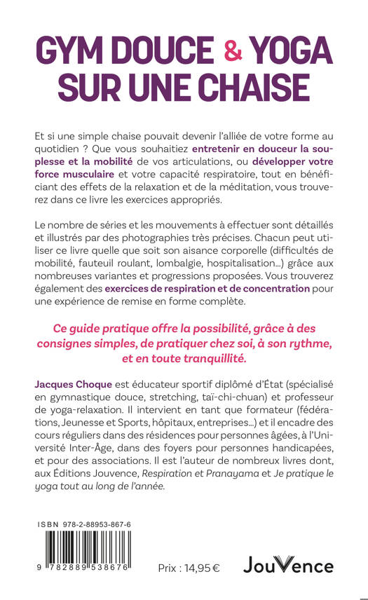 Et si une simple chaise pouvait devenir l’alliée de votre forme au quotidien ? Que vous souhaitiez entretenir en douceur la souplesse et la mobilité de vos articulations, ou développer votre force musculaire et votre capacité respiratoire, tout en bénéficiant des effets de la relaxation et de la méditation, vous trouverez dans ce livre les exercices appropriés. Le nombre de séries et les mouvements à effectuer sont détaillés et illustrés par des photographies très précises. Chacun peut utiliser ce livre quelle que soit son aisance corporelle (difficultés de mobilité, fauteuil roulant, lombalgie, hospitalisation…) grâce aux nombreuses variantes et progressions proposées. Vous trouverez également des exercices de respiration et de concentration pour une expérience de remise en forme complète. Ce guide pratique offre la possibilité, grâce à des consignes simples, de pratiquer chez soi, à son rythme, et en toute tranquillité.