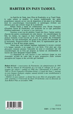 Au Sud-Est de l'Inde, dans l'État de Pondichéry et au Tamil Nadu, le cadre urbain se modifie. La maison traditionnelle des petits propriétaires tamouls est en voie de disparition et fait place à un habitat dont les caractéristiques fonctionnelles et stylistiques révèlent une attirance pour une certaine image de la modernité. L'auteur à mené une recherche sur un type particulier d'habitat traditionnel : la maison à cour intérieure. Il analyse chacune des parties constituantes de cette maison.