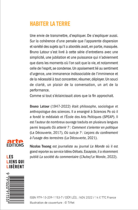 Bruno Latour a souhaité revisiter ses cinquante années de recherches au cours d'un entretien en deux parties avec le grand reporter Nicolas Truong. C'est pour le philosophe l'occasion de reprendre et poursuivre les éléments les plus importants de sa pensée sur notre nouvelle condition terrestre. Il déploie ses réflexions à partir de cette conviction : si l'homme tient à sa survie en tant qu'espèce, il lui faut apprendre à s'émanciper des grands paradigmes qui le guident depuis les Lumières. Un plaidoyer pour la philosophie envisagée comme une tentative magnifique et impossible d'embrasser la totalité. Une coédition avec Arte éditions.