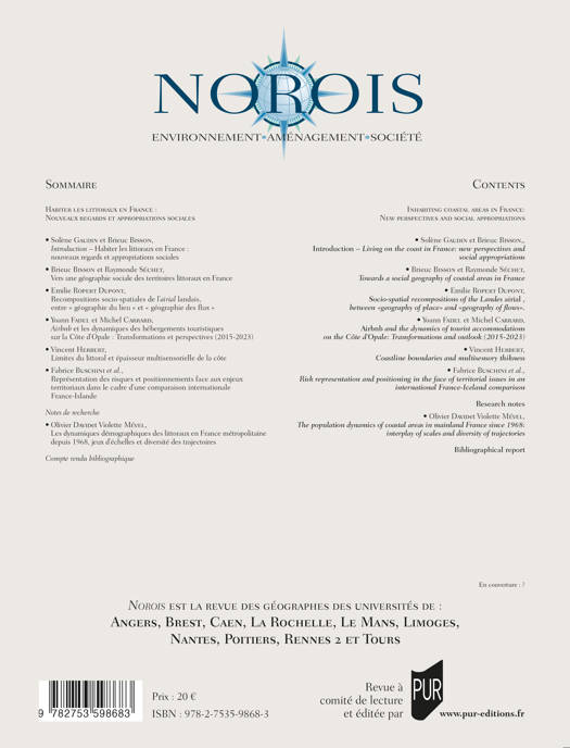 Dans le cadre du mouvement de littoralisation accentué dans le contexte français depuis une trentaine d'années, les espaces littoraux ont vu leur population changer de manière spectaculaire, (forte attractivité, nouvelles saisonnalités, habiter intermittent, concurrence spatiale de activités, nouveaux (dé)équilibres démographiques). Ce que l'on pourrait considérer comme une nouvelle phase de littoralisation engendre des recompositions touchant des espaces de plus en plus continentaux, jusqu'à questionner l'aire d'influence des littoraux. A travers de nouvelles pratiques résidentielles et d'attractivité territoriale, une pression immobilière forte, un étalement des activités, de multiples conflits d'usage, mais aussi des enjeux liés au logement, à la mixité sociale et inter-générationnelle, ce numéro propose de faire le tour des mutations affectant les espaces littoraux en France.