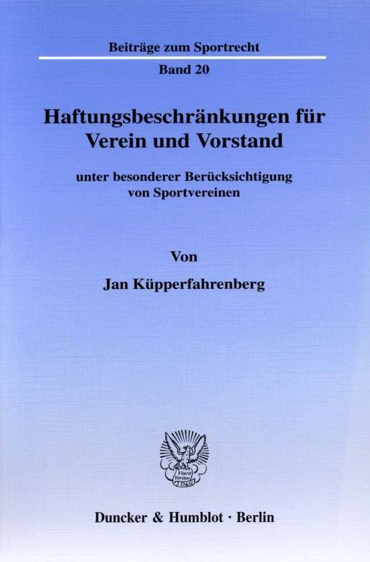 Vor diesem Hintergrund zeigt der Verfasser mit seiner Untersuchung die bestehende Haftung von Verein und Vorstand auf, sucht nach Möglichkeiten der Haftungsbeschränkung und stellt die Frage nach der Versicherbarkeit des persönlichen Haftungsrisikos des Vereinsvorstands. Die These, es gebe kein beachtliches Haftungsrisiko, stellt sich dabei als unzutreffend heraus.