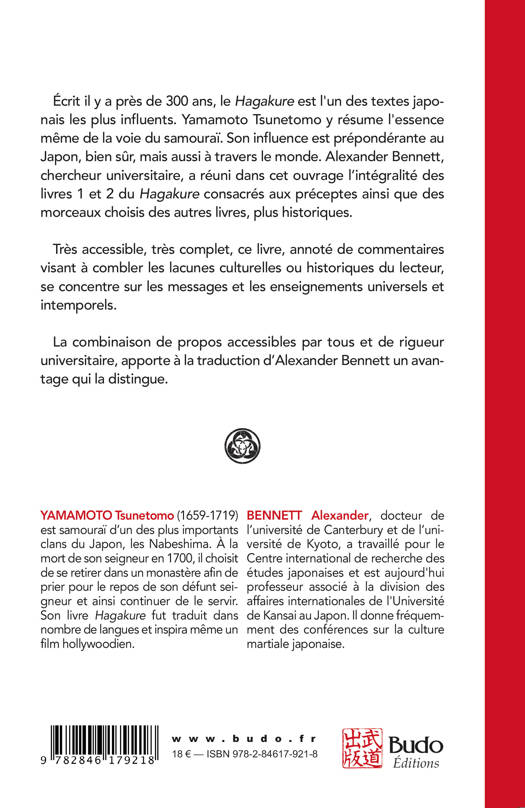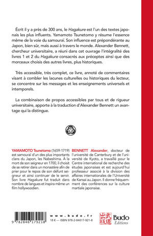 Écrit il y a près de 300 ans, le Hagakure est l'un des textes japonais les plus influents. Yamamoto Tsunetomo y résume l'essence même de la voie du samouraï. Son influence est prépondérante au Japon, bien sûr, mais aussi à travers le monde. Alexander Bennett, chercheur universitaire, a réuni dans cet ouvrage l’intégralité des livres 1 et 2 du Hagakure consacrés aux préceptes ainsi que des