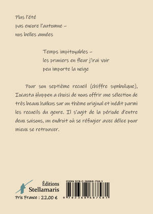 Pour son septième recueil (chiffre symbolique), Iocasta Huppen a choisi de nous offrir une sélection de très beaux haïkus sur un thème original et inédit parmi les recueils du genre. Il s’agit de la période d’entre deux saisons, un endroit où se réfugier avec délice pour mieux se retrouver.