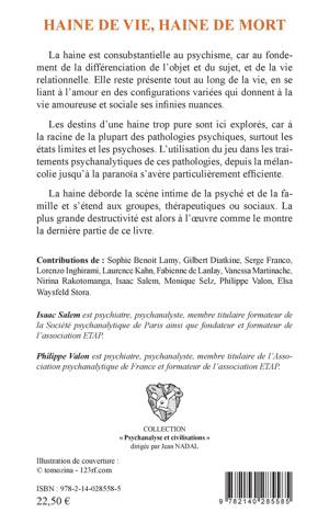 La haine est consubstantielle au psychisme, car au fondement de la différenciation de l'objet et du sujet, et de la vie relationnelle. Elle reste présente tout au long de la vie, en se liant à l'amour en des configurations variées qui donnent à la vie amoureuse et sociale ses infinies nuances. Les destins d'une haine trop pure sont ici explorés, car à la racine de la plupart des pathologies psychiques, surtout les états limites et les psychoses. L'utilisation du jeu dans les traitements psychanalytiques de ces pathologies, depuis la mélancolie jusqu'à la paranoïa s'avère particulièrement efficiente. La haine déborde la scène intime de la psyché et de la famille et s'étend aux groupes, thérapeutiques ou sociaux. La plus grande destructivité est alors à l'œuvre comme le montre la dernière partie de ce livre.
