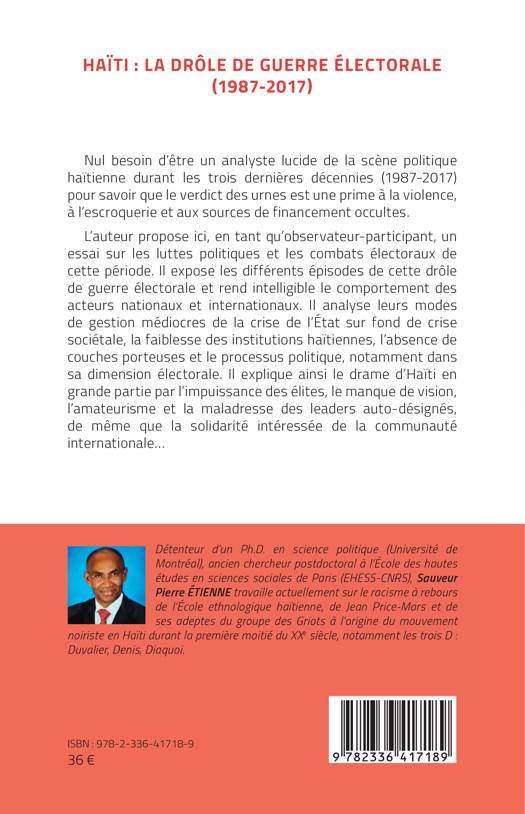 Nul besoin d’être un analyste lucide de la scène politique haïtienne durant les trois dernières décennies (1987-2017) pour savoir que le verdict des urnes est une prime à la violence, à l’escroquerie et aux sources de financement occultes. L’auteur propose ici, en tant qu’observateur-participant, un essai sur les luttes politiques et les combats électoraux de cette période. Il expose les différents épisodes de cette drôle de guerre électorale et rend intelligible le comportement des acteurs nationaux et internationaux. Il analyse leurs modes de gestion médiocres de la crise de l’État sur fond de crise sociétale, la faiblesse des institutions haïtiennes, l’absence de couches porteuses et le processus politique, notamment dans sa dimension électorale. Il explique ainsi le drame d’Haïti en grande partie par l’impuissance des élites, le manque de vision, l’amateurisme et la maladresse des leaders auto-désignés, de même que la solidarité intéressée de la communauté internationale…
