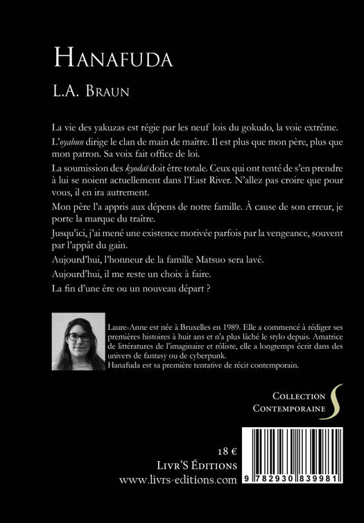 La vie des yakuzas est régie par les neuf lois du gokudo, la voie extrême. L’oyabun dirige le clan de main de maître. Il est plus que mon père, plus que mon patron. Sa voix fait office de loi. La soumission des kyodaï doit être totale. Ceux qui ont tenté de s’en prendre à lui se noient actuellement dans l’East River. N’allez pas croire que pour vous, il en ira autrement. Mon père l’a appris aux dépens de notre famille. À cause de lui, je porte la marque du traître. Jusqu’ici, j’ai mené une existence motivée parfois par la vengeance, souvent par l’appât du gain. Aujourd’hui, l’honneur de la famille Matsuo sera lavé. Aujourd’hui, il me reste un choix à faire. La fin d’une ère ou un nouveau départ ?