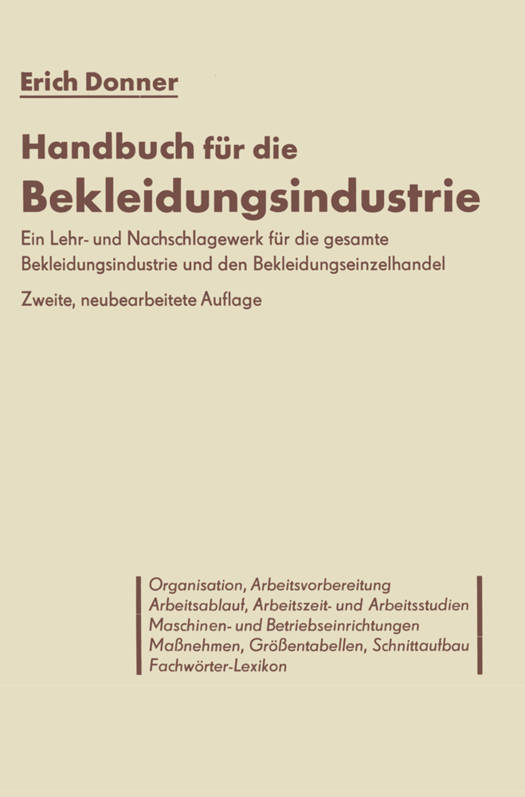 Die 1938 erschienene erste Auflage dieses Handbuches wurde den Lesern mit folgender Einleitung übergeben: "Der vorwärtsstrebenden deutschen Bekleidungsindustrie fehlte es bisher nicht nur an geeigneten und zusätzlichen Ausbildungsstätten, sondern es gab bis heute auch kein umfassendes organisatorisches und technisches Hand-und Lehrbuch oder Nachschlagewerk. Wenn der erste Übelstand durch die in Verbin- dung mit der Wirtschaftsgruppe Bekleidungsindustrie geschaffene erste Bekleidungsfachschule der Höheren Textilfachschule M.Gladbach-Rheydt beseitigt wurde, so soll dieses Handbuch die zweite Lücke füllen." In der Zwischenzeit konnte die damalige Bekleidungsfachschule durch die Aufnahme von Ingenieurlehrgängen der Fachrichtung Be- kleidung weiter ausgebaut werden. Außer der M. Gladbach-Rheydter Schule wurden weitere Fachschulen ins Leben gerufen, die ebenfalls schon sehr nützliche Arbeit leisten. Auch auf dem Gebiet der Fachliteratur sind zwischenzeitlich brauch- bare Werke erschienen. Außerdem ist in der "Bekleidung und Wäsche" eine allgemein geschätzte Fachzeitschrift auf den Markt gekommen. Endlich wurden auch zwei Forschungs-und Entwicklungsinstitute ge- gründet, die recht fruchtbar arbeiten. Dieser schulische, literarische, technische und auch entwicklungs- technische Aufbau charakterisiert den Weg der Bekleidungsindustrie vom Handwerk zu einem echten Industriezweig. Trotz dieser erfreu- lichen Entwicklung müssen alle an unserer Industrie interessierten Kräfte auch in Zukunft große Anstrengungen machen, unseren jungen Industriezweig technisch und organisatorisch weiter auszubauen. Diesem Ziel möchte der Verfasser auch mit der zweiten Auflage dieses Hand- buches dienen.
