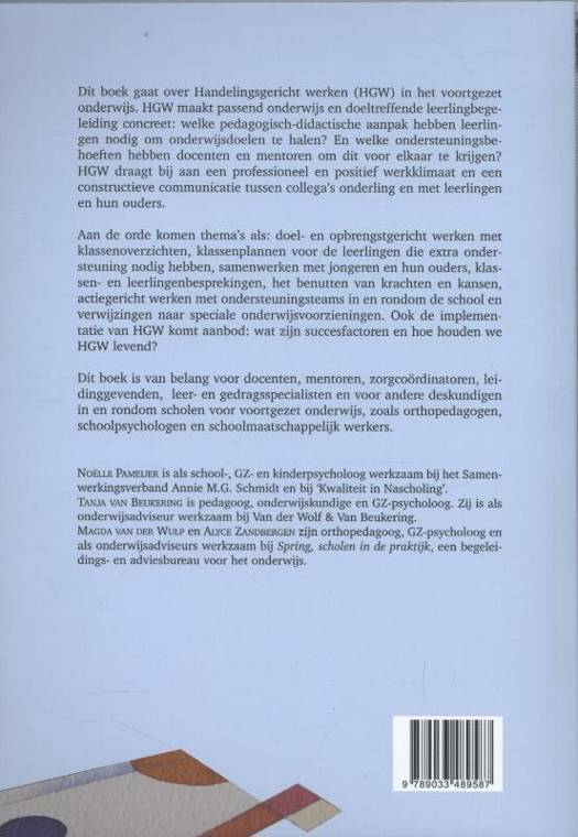 Handelingsgericht werken (HGW) beoogt de kwaliteit van het onderwijs te verbeteren en staat volop in de belangstelling. Het maakt passend onderwijs en doeltreffende leerlingbegeleiding concreet. HGW is doel- en opbrengstgericht en onderwijsbehoeften van leerlingen staan centraal: Wat hebben zij nodig om de onderwijsdoelen te behalen? Leraren bieden passend onderwijs en leveren daarmee een cruciale bijdrage aan de toekomst van leerlingen. Maar wat hebben zij hiervoor nodig: Wat zijn hun ondersteuningsbehoeften? De positieve aspecten van leerlingen, leraren en ouders zijn nodig voor inzicht in de situatie, ambitieuze doelen en voor een succesvol plan van aanpak.