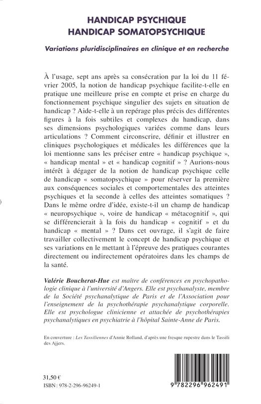 Comment circonscrire en clinique psychologique et médicale les différences, que la loi mentionne sans les préciser, entre "handicap psychique", "handicap mental" et "handicap cognitif" ? Y aurait-il intérêt à dégager de la notion de handicap psychique celle de handicap somatopsychique ? Existe-t-il un champ de handicap "neuropsychique" qui se différencierait à la fois du handicap cognitif et du handicap mental ?
