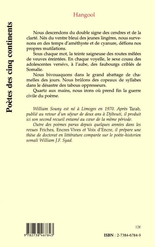 William SOUNY Nous descendons du double digne des cendres et de la clarté. Nés du ventre bleui des jeunes lingères, nous survenons en des temps d'améthyste et de cyanure, défions nos propres mutilations. Sous chaque mot, la teinte saigneuse des routes mêlées de veuves éreintées. En chaque voyelle, le sexe cousu des adolescentes versées, à l'aube, des faubourgs criblés de Somalie. Nous bivouaquons dans le grand abattage de chamelle des jours. Nous brûlons des copeaux de syllabes dans le désastre des tabous oppresseurs. Quartz aux mains, nous irons où prend fin la guerre civile du poème.