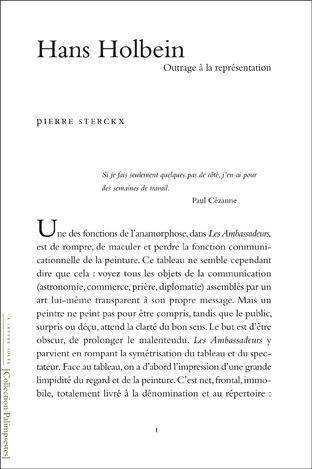 Une série d'études consacrées aux Ambassadeurs de H. Holbein selon une approche deleuzienne. Tente d'expérimenter une manière d'écrire avec la peinture plutôt que sur ou à propos d'elle. Pour la première fois, un tableau affiche son espace propre face à celui du spectateur et propose activement un vide essentiel désignant le destinataire de la représentation : le spectateur-roi.