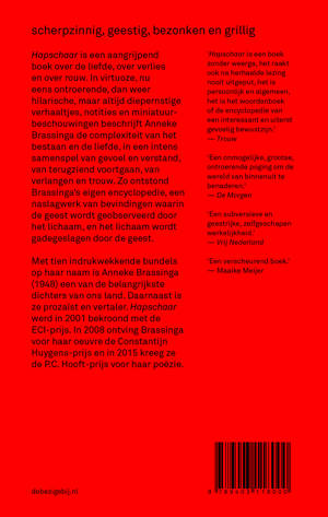 Hapschaar is een aangrijpend boek over de liefde, over verlies en over rouw. In virtuoze, nu eens ontroerende, dan weer hilarische, maar altijd diepernstige verhaaltjes, notities en miniatuurbeschouwingen beschrijft Anneke Brassinga de complexiteit van het bestaan en de liefde, in een intens samenspel van gevoel en verstand, van terugziend voortgaan, van verlangen en trouw. Zo ontstond Brassinga’s eigen encyclopedie, een naslagwerk van bevindingen waarin de geest wordt geobserveerd door het lichaam, en het lichaam wordt gadegeslagen door de geest.