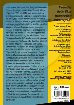 « Hors normes, hors cadres, hors champ. L'oeuvre comme l'homme. Le critique canadien John Clute a dit d'Harlan Ellison (mai 1934 - juin 2018) qu'il « écrivait à pleins poumons » Une manière élégante de souligner combien lire Ellison, c'est souvent prendre un direct à l'estomac - ou plus bas. Travailleur acharné, exigeant envers lui-même et les autres jusqu'à l'excès, sincère et sans filtre, considéré comme un génie par beaucoup, comme un connard égotique et violent par certains, il ne laissait personne indifférent. « J'ai marché de Selma à Montgomery aux côtés de Martin Luther King. J'ai travaillé avec César Chávez dans la vallée de Coachella pendant la grève des pamplemousses. J'ai affronté le Ku Klux Klan, j'ai donné des milliers d'heures de conférences en faveur de l'amendement sur l'égalité des droits à l'époque où nous cherchions à le faire adopter par le Sénat... » Ellison était de cette trempe d'écrivains qui, à l'instar d'un Ernest Hemingway, considèrent qu'il faut « avoir fait » avant de raconter, et estiment que l'engagement et la conviction sont les fondements même d'une oeuvre littéraire. « Je crée des récits. Je suis un écrivain. [...] Je n'aspire qu'à ça et, par essence, c'est tout ce que je suis. » Son oeuvre est pléthorique. Très peu de romans, mais des nouvelles par centaines, des scénarios pour quantité de séries télé, de Star Trek à Babylon 5, des articles et des essais en pagaille, Ellison nous laisse en partage une oeuvre unique, brûlante, et d'une actualité qui, par certains aspects, n'a jamais été si criante. Une oeuvre politique, en somme, engagée jusqu'à l'os, un coup de pied dans la fourmilière de la bien-pensance généralisée, du conservatisme et du repli identitaire ambiant. Une arme de destruction massive plus que jamais nécessaire. Àl'assaut : lisons Harlan Ellison ! »