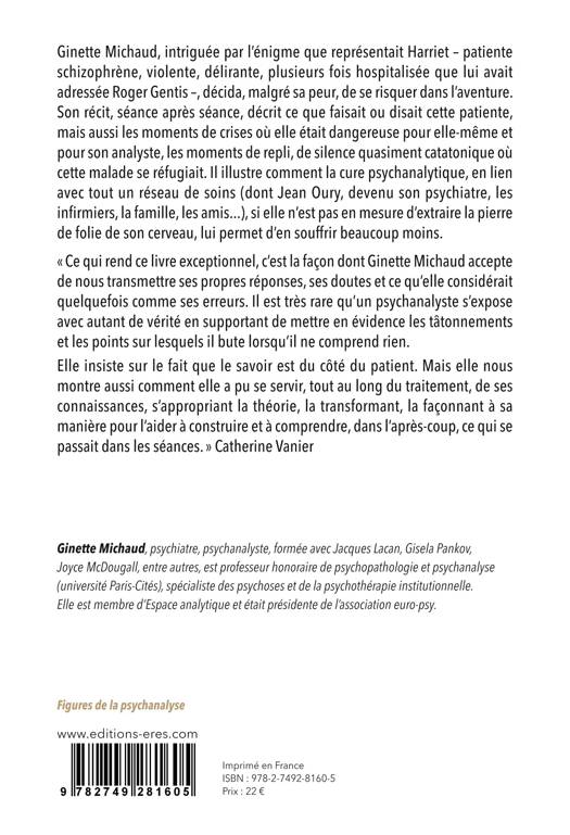 Ginette Michaud, intriguée par l'énigme que représentait Harriet - patiente schizophrène, violente, délirante, plusieurs fois hospitalisée que lui avait adressée Roger Gentis -, décida, malgré sa peur, de se risquer dans l'aventure. Son récit, séance après séance, décrit ce que faisait ou disait cette patiente, mais aussi les moments de crises où elle était dangereuse pour elle-même et pour son analyste, les moments de repli, de silence quasiment catatonique où cette malade se réfugiait. Il illustre comment la cure psychanalytique, en lien avec tout un réseau de soins (dont Jean Oury, devenu son psychiatre, les infirmiers, la famille, les amis...), si elle n'est pas en mesure d'extraire la pierre de folie de son cerveau, lui permet d'en souffrir beaucoup moins.