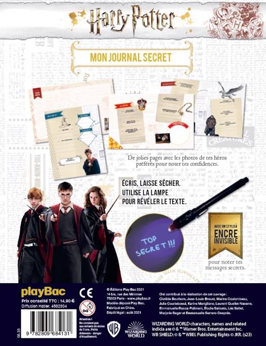 Dans ce journal intime aux couleurs d'Harry Potter, tes secrets seront bien gardés ! Grâce au stylo à encre invisible, écris tes messages secrets et tes confidences, laisse sécher et utilise la lampe pour révéler le texte. Magique ! Ce journal contient de jolies pages illustrées pour retrouver tout l'univers de Poudlard, un stylo à encre invisible et un cadenas doré avec sa clé pour bien enfermer tes secrets. Le cadeau idéal pour tous les fans et les sorciers en herbe !