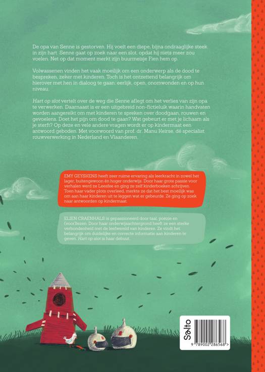 De opa van Senne is gestorven. Hij voelt een diepe, bijna ondraaglijke steek in zijn hart. Senne gaat op zoek naar een slot, opdat hij niets meer zou voelen. Net op dat moment merkt zijn buurmeisje Fien hem op.Volwassenen vinden het vaak moeilijk om een onderwerp als de dood te bespreken, zeker met kinderen. Toch is het ontzettend belangrijk om hierover met hen in dialoog te gaan: eerlijk, open, onomwonden en op hun niveau.Hart op slot vertelt over de weg die Senne aflegt om het verlies van zijn opa te verwerken. Daarnaast is er een uitgebreid non-fictieluik waarin handvaten worden aangereikt om met kinderen te spreken over doodgaan, rouwen en gevoelens. Doet het pijn om dood te gaan? Wat gebeurt er met je lichaam als je sterft? Op deze en vele andere vragen wordt er op kindermaat een antwoord geboden. Met voorwoord van prof. dr. Manu Keirse, dé specialist rouwverwerking in Nederland en Vlaanderen.