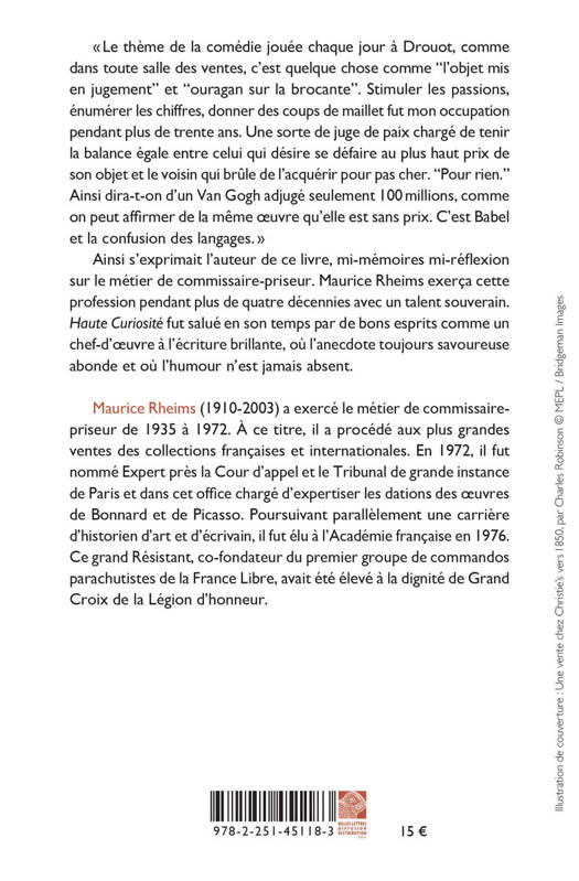 Le theme de la comedie jouee chaque jour a Drouot, comme dans toute salle des ventes, c'est quelque chose comme "l'objet mis en jugement" et "ouragan sur la brocante". Stimuler les passions, enumerer les chiffres, donner des coups de maillet fut mon occupation pendant plus de trente ans. Une sorte de juge de paix charge de tenir la balance egale entre celui qui desire se defaire au plus haut prix de son objet et le voisin qui brule de l'acquerir pour pas cher. "Pour rien." Ainsi dira-t-on d'un Van Gogh adjuge seulement 100 millions, comme on peut affirmer de la meme oeuvre qu'elle est sans prix. C'est Babel et la confusion des langages. Ainsi s'exprimait l'auteur de ce livre, mi-memoires mi-reflexion sur le metier de commissaire-priseur. Maurice Rheims exerca cette profession pendant plus de quatre decennies avec un talent souverain. Haute Curiosite fut salue en son temps par de bons esprits comme un chef-d'oeuvre a l'ecriture brillante, ou l'anecdote toujours savoureuse abonde et ou l'humour n'est jamais absent.