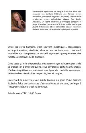 Entre les êtres humains, c’est souvent électrique… Désaccords, incompréhensions, rivalités, abus et autres trahisons : les neuf nouvelles qui composent ce recueil explorent quelques-unes des facettes explosives de la discorde. Dans cette galerie de portraits, des personnages cabossés par la vie se croisent et s’entrechoquent. Tous différents, certains attachants, d’autres inquiétants – mais avec une ligne de conduite commune : défendre leurs territoires respectifs, bec et ongles. Un recueil de nouvelles sous haute tension, qui joue d’une écriture littéraire faite de contrastes d’atmosphères et de tons, du léger à l’insupportable, du cruel au poétique.