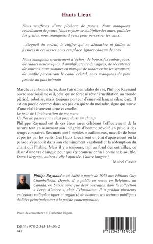 Marcheur en bonne terre, dans l'air et les rafales de la vie, Philippe Raynaud ouvre son troisième oeil, celui qui ne force ni rêve ni méditation, au monde piétiné, robotisé mais toujours porteur d'émerveillement silencieux. Il est en poésie comme dans ses pas en quête du moindre signe qui sauve d'une réalité souvent drue et cruelle. Il célèbre l'effleurement de la Nature tout en assumant son intégrité d'homme révolté en proie à des temps contraires. Ces Hauts Lieux sont un état d'apaisement où la pensée s'épanouit dans son cheminement vagabond.