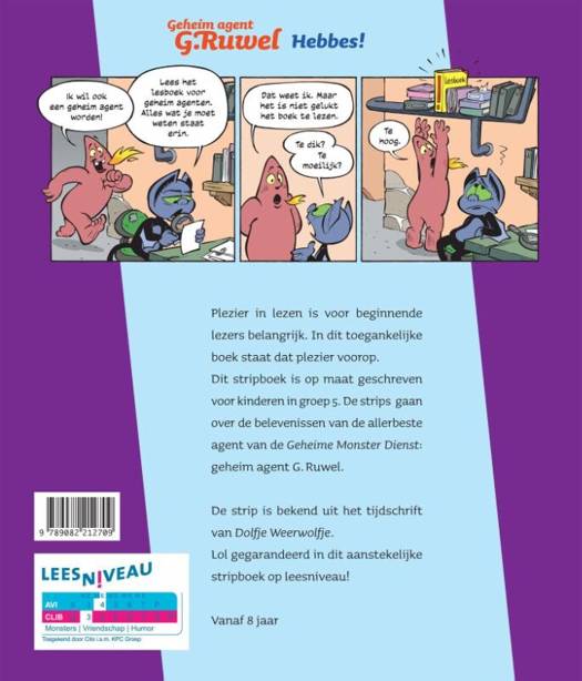 Plezier in lezen is voor beginnende lezers belangrijk. In dit toegankelijke boek staat dat plezier voorop. Deze strip is op maat geschreven voor kinderen in groep 5 en gaat over de belevenissen van de allerbeste agent van de Geheime Monster Dienst: geheim agent G. Ruwel. De strip is bekend uit het tijdschrift van Dolfje Weerwolfje. Lol gegarandeerd in dit aanstekelijke stripboek op leesniveau (AVI E4)! Vanaf 8 jaar