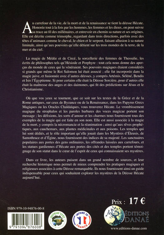 Au carrefour de la vie, de la mort et de la renaissance se tient la déesse Hécate. Honorée tout à la fois par les hommes, les femmes et les dieux, on peut suivre sa trace au fil des millénaires, et entrevoir en chemin sa nature et ses origines. Elle est décrite comme trimorphe, regardant dans trois directions, parfois avec des têtes d'animaux comme le cheval, le chien et le serpent, faisant allusion à sa nature liminale, ainsi qu'aux pouvoirs qu'elle détient sur les trois mondes de la terre, de la mer et du ciel. La magie de Médée et de Circé, la sorcellerie des femmes de Thessalie, les écrits de philosophes tels qu'Hésiode et Porphyre : tout cela nous donne des aperçus du monde de ceux qui la vénéraient. Ses pouvoirs magiques étaient considérés si grands que même le Roi Salomon lui était associé ; elle fut incorporée dans la magie juive, et fusionnée avec d'autres déesses, y compris Artémis, Séléné, Bendis et Isis l'Égyptienne. Si pour certains elle était la Déesse Sorcière, pour d'autres elle était la maîtresse des anges et des daimones, qui fit des prédictions sur Jésus et le Christianisme. Où que vos yeux se tournent, que ce soit sur les textes de la Grèce et de la Rome antiques, sur ceux de Byzance ou de la Renaissance, dans les Papyrus Grecs Magiques ou les Oracles Chaldaïques, vous trouverez Hécate. Le vrombissement magique du strophalos et les paroles barbares des voces magicae portent son message ; les défixions, les sorts d'amour et les charmes nous fournissent tous des exemples de la magie qui est faite en son nom. Elle est aussi associée à la magie de la mort, y compris la nécromancie et la réanimation ; ainsi qu'aux rêves prophétiques, aux cauchemars, aux plantes médicinales et aux poisons. Les temples qui lui sont dédiés, et le rôle important qu'elle jouait dans les Mystères d'Eleusis, de Samothrace et d'Egine, nous fournissent des indices de sa majesté. Les sanctuaires populaires aux portes des gens ordinaires, les offrandes laissées aux carrefours, et les statues gardiennes d'Hécate aux portes des cités et des temples portent témoignage de son statut dans le coeur de l'esprit de ceux qui connaissaient ses mystères. Dans ce livre, les auteurs puisent dans un grand nombre de sources, et leur recherche historique nous permet de mieux comprendre les pratiques magiques et religieuses associées à cette Déesse remarquable. Ils nous fournissent ainsi un guide indispensable pour ceux qui souhaitent explorer les mystères de la Déesse Hécate aujourd'hui.