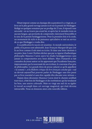 S'etant impose comme un classique des sa parution il y a vingt ans, ce livre est le plus grand ouvrage jamais ecrit sur la pensee de Heidegger. Redige en quelques semaines par un prodige de 23 ans, il repond a une necessite: on ne trouve pas avant lui, ni apres lui, le moindre texte en aucune langue, qui permette de comprendre clairement l'ensemble et le sens de la pensee heideggerienne. Pour la premiere fois et la seule, un monument de style et de puissance speculative se met au service de ce que Heidegger a voulu dire. A sa publication le succes est unanime: le monde universitaire, le public et la presse sont admiratifs. Jean-Francois Marquet dit que c'est la un livre comme il eut aime en ecrire. Et dans une lettre destinee a ses pairs, Jean-Louis Chretien declare que par sa rigueur d'authentique philosophe Maxence Caron sauve les etudes heideggeriennes sans jamais se compromettre avec leurs defauts. Marc Fumaroli se fait connaitre du jeune auteur en lui apprenant que l'Academie francaise, impressionnee par la nouveaute de son ecriture, le couronne d'un prix de philosophie. Les grands titres de presse saluent ce qu'ils appellent " la somme ", et le Bulletin critique du livre francais conclut que " nul ne devrait aujourd'hui pouvoir parler de Heidegger sans etre passe par ce livre essentiel et sans etre capable d'en discuter avec serieux ". Depuis deux decennies Maxence Caron dont le chemin semblait tout trace, a bati loin de Heidegger et des institutions qui lui tendaient les bras, une oeuvre colossale. Mais en vingt ans nul n'a su egaler le travail accompli dans cet ouvrage magistral, qui etait devenu introuvable. Nous en donnons ainsi cette nouvelle edition.