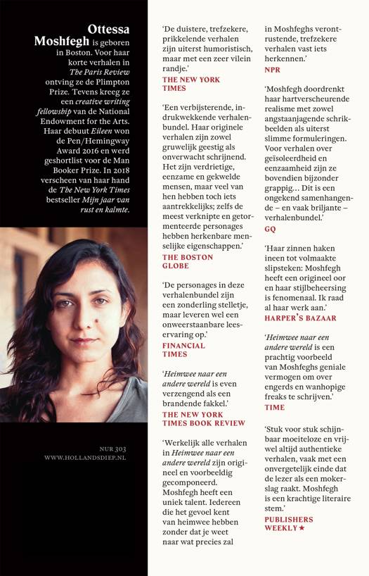 'Ik kan me de laatste keer dat ik zo hard om een boek gelachen heb niet herinneren', schreef David Sedaris nadat hij de verhalenbundel Heimwee naar een andere wereld van Ottessa Moshfegh had gelezen. Maar onder die humor zit een onheilspellende ondertoon waardoor je als lezer nooit precies weet wat er aan de hand is. De personages zijn altijd op een of andere manier onhandig; ze verlangen naar contact met anderen en proberen hun leven te beteren, ieder op hun eigen manier, maar worden vaak gehinderd door verkeerde prikkels en existentiële onzekerheden. Heimwee naar een andere wereld is een masterclass in de variaties van zelfbedrog via een breed scala aan personages die leven in onze huidige tijd. Moshfegh laat ons kennis maken met een onvergetelijke parade aan kleurrijke types, die nog lang een plek in de gedachten van de lezer blijven innemen.