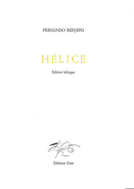« Nous sommes partis du chaos et nous avons déchu », c’est par ce vers unique sur la page que cette Hélice commence son forage, qui va prendre corps vers après vers, page après page, tourner sur elle-même en s’élargissant, creuser sa pensée avant de se rétracter sous l’effet de la rotation pour finir comme elle avait commencé, en une succession de paroles brèves et acérées. Partir du chaos, prendre son essor, déchoir, trois mouvements du poème, trois mouvements de la vie humaine que le poète et dramaturge espagnol Fernando Renjifo entrelace – « faufile » comme on le dit joliment en couture – dans ce livre dont la beauté doit beaucoup à la force retenue, méditative, à un mélange de fables minimalistes et de fulgurances secrètes. Cette communication entre l’intime et le monde qui n’oublie jamais sa part de contradiction, cette tension constante entre réel et abstraction, entre mentalité et sentiment, entre « dette » et « espérance », irrigue le texte d’une mélancolie moins inquiète de la disparition personnelle que de la chute collective. L’espèce est en voie de disparition, à chaque échelle, intime depuis toujours, collective depuis peu. Une disparition qui au gré de visions puissantes coïncide avec le linge étendu qui disparaît à nos fenêtres ou aux chaises vides sur la lande, et médite sur l’effacement des noms, des objets, des animaux. Une disparition petite et quotidienne comme celle des soleils, presque heureuse de son insignifiance. Un regard archaïque se pose sur ces pages pleines d’absence, au fil d’une pensée qui s’articule de façon hélicoïdale, cherche à remonter à la source, à notre première matière selon une boucle ADN – nous sommes « matière et mouvement », faits « de hasard et de vide » dit Renjifo –, à la « cause première » de l’humanité, de sa divagation et de son détournement. L’espèce se trouve expulsée, au milieu d’un monde en décomposition, après avoir tourné le dos au chaos, à la confusion, au règne animal pour se retrouver entre les mains de l’ordre, des nombres et de la loi. Il reste malgré tout le désir, le désir humain qui persiste en ces « temps de jachère », et qui se laisse soulever par la « rage de la mer » et une certaine « odeur du monde ». Désir du centaure qui a aimé un humain, qui a touché la terre, désir des corps qui se sont baignés dans l’eau. Ou douceur de voir les enfants jouer sur le balcon, douceur encore de reposer la tête dans un rire. Accompagnant la rotation de l’hélice, il s’agit de retenir à soi désir et douceur même quand « le monde va au délire » et que « les animaux ont fui ».