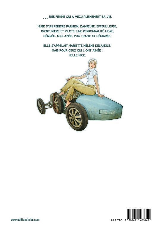 Hellé Nice est une pilote automobile de l’entre-deux-Guerres, née le 15 décembre 1900 à Aunay-sous-Auneau. La fin de sa vie, à Nice, en 1984, dans la pauvreté et l’indifférence générale, s’inscrit en contraste avec la flamboyance de ses exploits sportifs et de ses spectacles osés des années folles. Le 2 juin 1929, Hellé Nice avait remporté sa première course de Grand-Prix féminin sur l’Autodrome de Linas-Montlhéry. Le 2 décembre, sur le même circuit, elle avait atteint—au volant d’une Bugatti Type 35C- la vitesse de 194 km/h de moyenne sur les 10 tours de l’épreuve. A son palmarès : un nouveau record du monde de vitesse féminin officiel l’année suivante. Les grands prix nord-américains et brésiliens, contre des hommes, ne lui faisaient pas peur, bien qu’il se fût agi des meilleurs pilotes du moment. Après la guerre, elle fut injustement dénoncée comme collaboratrice. Tous ses sponsors et ses amis se détournèrent alors d’elle. Ce biopic offre l’occasion de réhabiliter sa mémoire et de revenir sur la remarquable créativité de l’époque, tant artistique que technique. Le Paris des années folles et les modèles Bugatti sont mis à l’honneur. Le talent artistique de Giuseppe Manunta s’exprime comme jamais dans cet album où les couleurs bleu et sépia s’entremêlent. Les corps féminins se dévoilent, les bolides des années 30 exhibent la puissance de leurs moteurs, leur maniabilité et leur dangerosité pour le plus grand plaisir des spectateurs. Les dandys et les amateurs d’art rivalisent d’imagination pour se mettre en scène dans des décors grandioses.