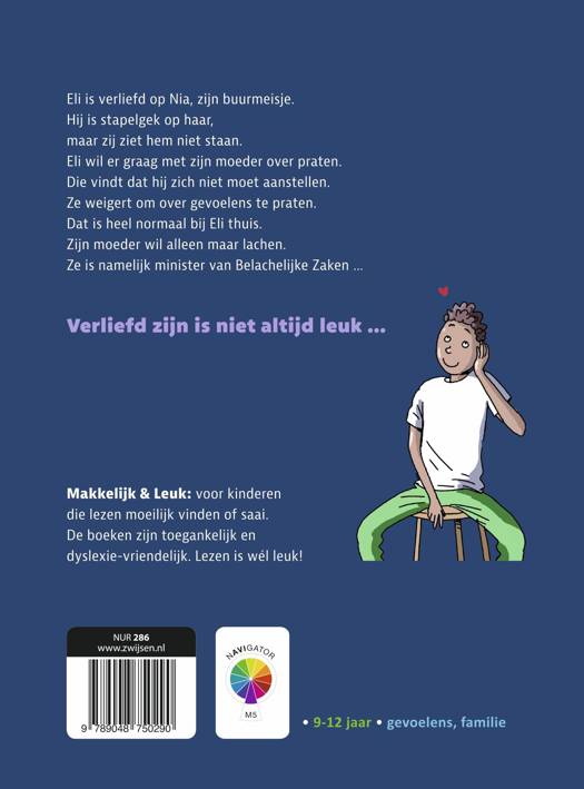 Eli’s moeder neemt niets serieus, alles moet grappig zijn. Maar nu Eli verliefd is op zijn buurmeisje Nia wil hij daar graag over praten met zijn moeder, maar hoe? Lukt het Eli om door te dringen tot zijn moeder? En zal Nia ook verliefd worden op hem? Leuk verhaal op laag AVI-niveau (AVI M5) voor kinderen van 9 tot 12 jaar. De serie ‘Makkelijk & Leuk’ is speciaal gemaakt voor kinderen die lezen moeilijk vinden of saai. Zo krijgen zij weer plezier in lezen.