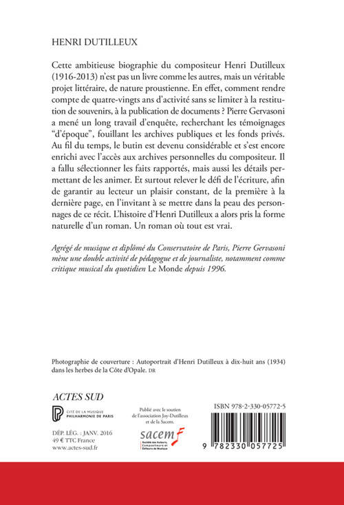 Cette ambitieuse biographie du compositeur Henri Dutilleux (1916-2013) n'est pas un livre comme les autres, mais un véritable projet littéraire, de nature proustienne. En effet, comment rendre compte de quatre-vingts ans d'activité sans se limiter à la restitution de souvenirs, à la publication de documents ? Pierre Gervasoni a mené un long travail d'enquête, recherchant les témoignages "d'époque", fouillant les archives publiques et les fonds privés. Au fil du temps, le butin est devenu considérable et s'est encore enrichi avec l'accès aux archives personnelles du compositeur. Il a fallu sélectionner les faits rapportés, mais aussi les détails permettant de les animer. Et surtout relever le défi de l'écriture, afin de garantir au lecteur un plaisir constant, de la première à la dernière page, en l'invitant à se mettre dans la peau des personnages de ce récit. L'histoire d'Henri Dutilleux a alors pris la forme naturelle d'un roman. Un roman où tout est vrai.
