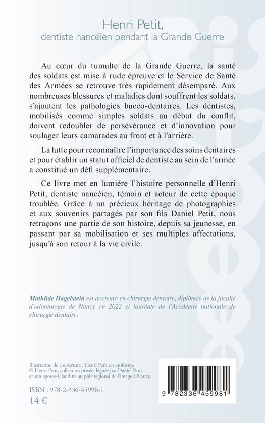 Au coeur du tumulte de la Grande Guerre, la santé des soldats est mise à rude épreuve et le Service de Santé des Armées se retrouve très rapidement désemparé. Aux nombreuses blessures et maladies dont souffrent les soldats, s'ajoutent les pathologies bucco-dentaires. Les dentistes, mobilisés comme simples soldats au début du conflit, doivent redoubler de persévérance et d'innovation pour soulager leurs camarades au front et à l'arrière. La lutte pour reconnaître l'importance des soins dentaires et pour établir un statut officiel de dentiste au sein de l'armée a constitué un défi supplémentaire. Ce livre met en lumière l'histoire personnelle d'Henri Petit, dentiste nancéien, témoin et acteur de cette époque troublée. Grâce à un précieux héritage de photographies et aux souvenirs partagés par son fils Daniel Petit, nous retraçons une partie de son histoire, depuis sa jeunesse, en passant par sa mobilisation et ses multiples affectations, jusqu'à son retour à la vie civile.
