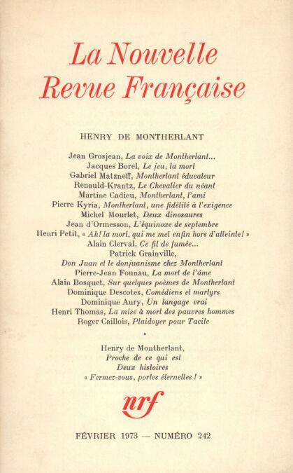 Jean Grosjean, La voix de Montherlant... Jacques Borel, Le jeu, la mort Gabriel Matzneff, Montherlant éducateur Renauld-Krantz, Le Chevalier du Néant Martine Cadieu, Montherlant, l'ami Pierre Kyria, Montherlant, une fidélité à l'exigence Michel Mourlet, Deux dinosaures Jean d' Ormesson, L'équinoxe de septembre Marc Petit, 'Ah! la mort, qui me met enfin hors d'atteinte!' Alain Clerval, Ce fil de fumée... Patrick Grainville, Don Juan et le donjuanisme chez Montherlant Pierre Jean Founau, La mort de l'âme Alain Bosquet, Sur quelques poèmes de Montherlant Dominique Descotes, Comédiens et martyrs Dominique Aury, Un langage vrai Henri Thomas, La mise à mort des pauvres hommes Roger Caillois, Plaidoyer pour Tacite Henry de Montherlant, Proche de ce qui est - Deux histoires - 'Fermez-vous, portes éternelles!'