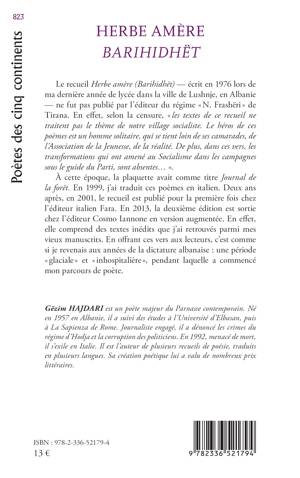 Le recueil Herbe amère (Erbamara) - écrit en 1976 lors de ma dernière année de lycée dans la ville de Lushnje, en Albanie - ne fut pas publié par l'éditeur du régime N. Frashëri de Tirana. En effet, selon la censure, les textes de ce recueil ne traitent pas le thème de notre village socialiste. Le héros de ces poèmes est un homme solitaire, qui se tient loin de ses camarades, de l'Association de la Jeunesse, de la réalité. De plus, dans ces vers, les transformations qui ont amené au Socialisme dans les campagnes sous le guide du Parti, sont absentes... . À cette époque, la plaquette avait comme titre Le journal de la forêt. En 1999, j'ai traduit ces poèmes en italien. Deux ans après, en 2001, le recueil est publié pour la première fois chez l'éditeur italien Fara. En 2013, la deuxième édition est sortie chez l'éditeur Cosmo Iannone en version augmentée. En effet, elle comprend des textes inédits que l'auteur a retrouvés parmi ses vieux manuscrits. En offrant ces vers aux lecteurs, c'est comme si je revenais aux années de la dictature albanaise une période glaciale et inhospitalière, pendant laquelle a commencé mon parcours de poète.