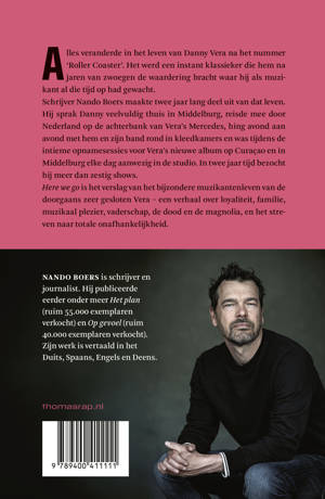 Het nummer ‘Roller Coaster’ veranderde het leven van Danny Vera. Het werd een instant klassieker en bracht hem na jaren van zwoegen de waardering die hij als muzikant najaagde. Schrijver Nando Boers bevond zich de afgelopen twee jaar in de binnenste ring van Danny Vera’s leven. Hij sprak hem veelvuldig thuis in Middelburg, reisde mee door Nederland op de achterbank van Vera’s Mercedes, hing avond aan avond met hem en zijn band rond in kleedkamers en was tijdens de intieme opnamesessies voor Vera’s nieuwe album op Curaçao en in Middelburg elke dag aanwezig in de studio. Boers bezocht de afgelopen twee jaar meer dan zestig shows. Here we go is de neerslag van het bijzondere muzikantenleven van de doorgaans zeer gesloten Vera – een verhaal over loyaliteit, familie, muzikaal plezier, vaderschap, de dood en de magnolia, en het streven naar totale onafhankelijkheid.