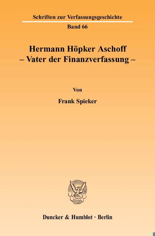 Frank Spieker erforscht und würdigt den Einfluss Hermann Höpker Aschoffs auf die Entstehung der Finanzverfassung des Grundgesetzes aus juristischer Sicht. Die historische Tradition deutscher Finanzverfassungen, Höpker Aschoffs Wirken im Parlamentarischen Rat und die Interventionen der Alliierten haben die Finanzverfassung des Grundgesetzes wesentlich geformt. Sein besonderes Verdienst ist die Durchsetzung einer finanziell starken und unabhängigen Bundesgewalt. Der Autor analysiert ferner das Wirken Hermann Höpker Aschoffs als Präsident des Bundesverfassungsgerichts. Trotz seiner kurzen Amtszeit hat er Ansehen, Stellung und das noch heute gültige Selbstverständnis des Gerichts beeinflusst. Dies belegen die Statusfrage und das erste grundlegende Urteil des Bundesverfassungsgerichts zur Finanzverfassung.