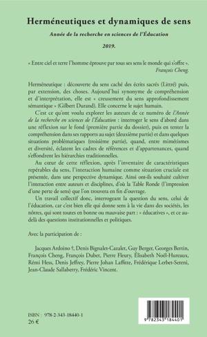 Herméneutiques : découverte du sens caché des écrits sacré (Littré) puis, par extension, des choses. Aujourd'hui synonyme de compréhension et d'interprétation, elle est "creusement du sens approfondissement sémantique" (Gilbert Durand). Elle concerne le sujet humain. C'est ce qu'on voulu explorer les auteurs de ce numéro de l'Année de la recherche en sciences de l'Education : interroger le sens d'abord dans une réflexion sur le fond, puis en tenter la compréhension dans ses rapports au sujet et dans quelques situations problématiques, quand, entre mimétismes et diversité, éclatent les cadres de références et d'appartenances, quand s'effondrent les hiérarchies traditionnelles.