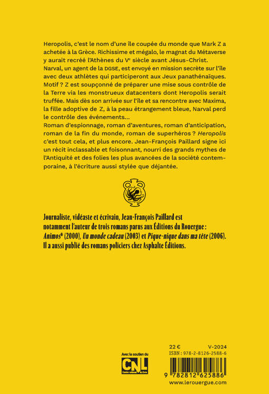 Heropolis, c'est le nom d'une île coupée du monde que Mark Z a achetée à la Grèce. Richissime et mégalo, le magnat du Métavers y aurait recréé l'Athènes du Ve siècle avant Jésus-Christ. Narval, un agent de la DGSE, est envoyé en mission secrète sur l'île avec deux athlètes qui participeront aux Jeux panathénaïques. Motif ? Z est soupçonné de préparer une mise sous contrôle de la Terre via les monstrueux datacenters dont Heropolis serait truffée. Mais dès son arrivée sur l'île et sa rencontre avec Maxima, la fille adoptive de Z à la peau étrangement bleue, Narval perd le contrôle des événements... Roman d'espionnage, roman d'aventures, roman d'anticipation, roman de la fin du monde, roman de superhéros ? Heropolis c'est tout cela, et plus encore. Jean-François Paillard signe ici un récit inclassable et foisonnant, nourri des grands mythes de l'Antiquité et des folies les plus avancées de la société contemporaine, à l'écriture aussi stylée que déjantée.